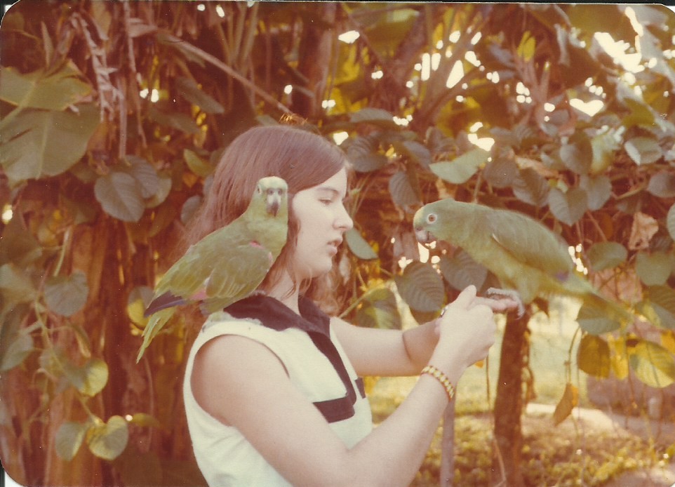 Maino med tre av våre mange småpapegøyer “pivichos”. Sonya med papegøyene, vår Klara og Wilhelms Polly, som begge var flinke til å prate og synge. Dessuten hadde vi små vannskilpadder som holdt til i et stort “badekar” ved vanntanken