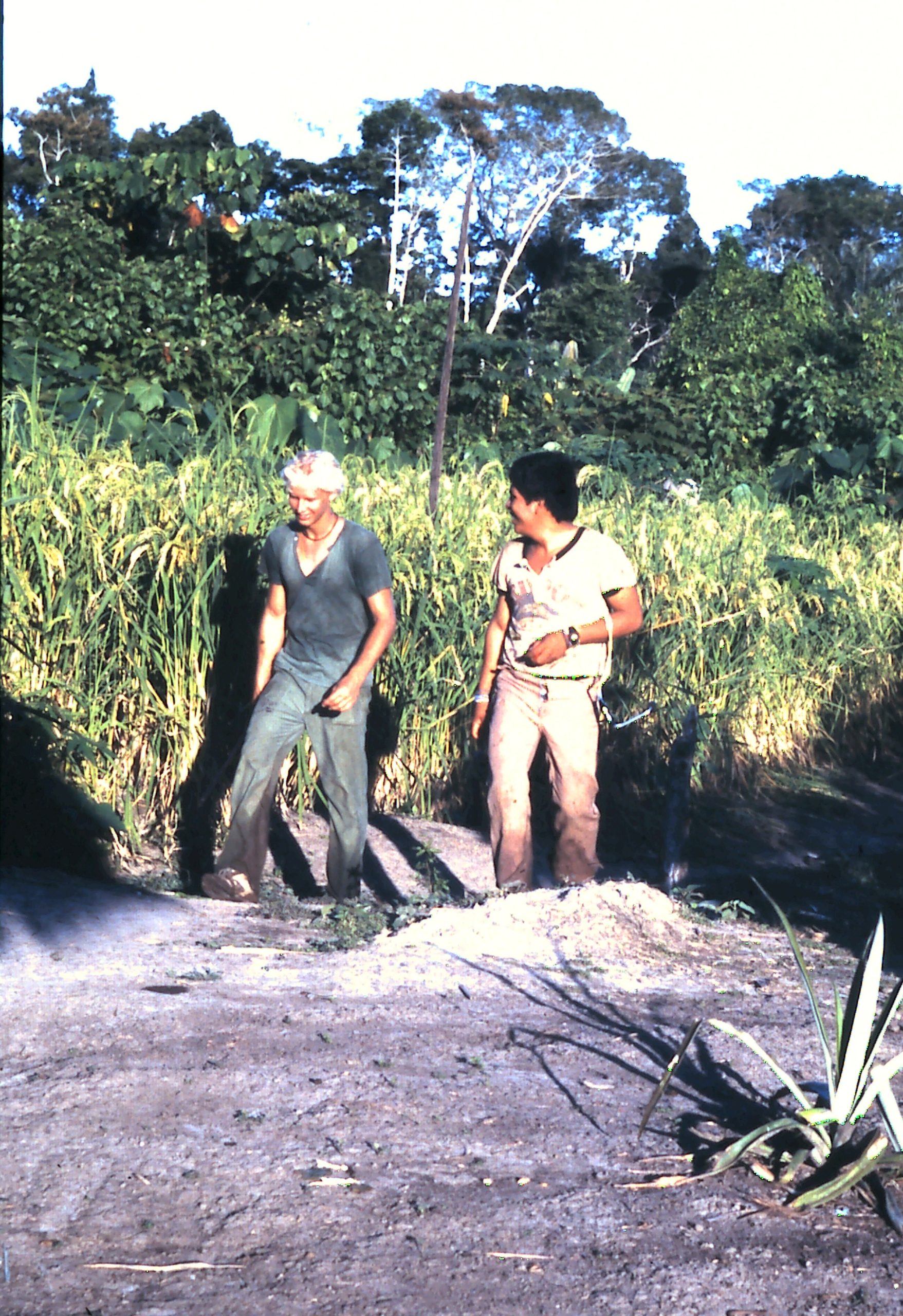 I Nueva Shoroya. Tariri med datter og svigersønn trenger medisiner. Til høyre på møte i den nybygde kirken da vi besøkte stedet i desember 1986.