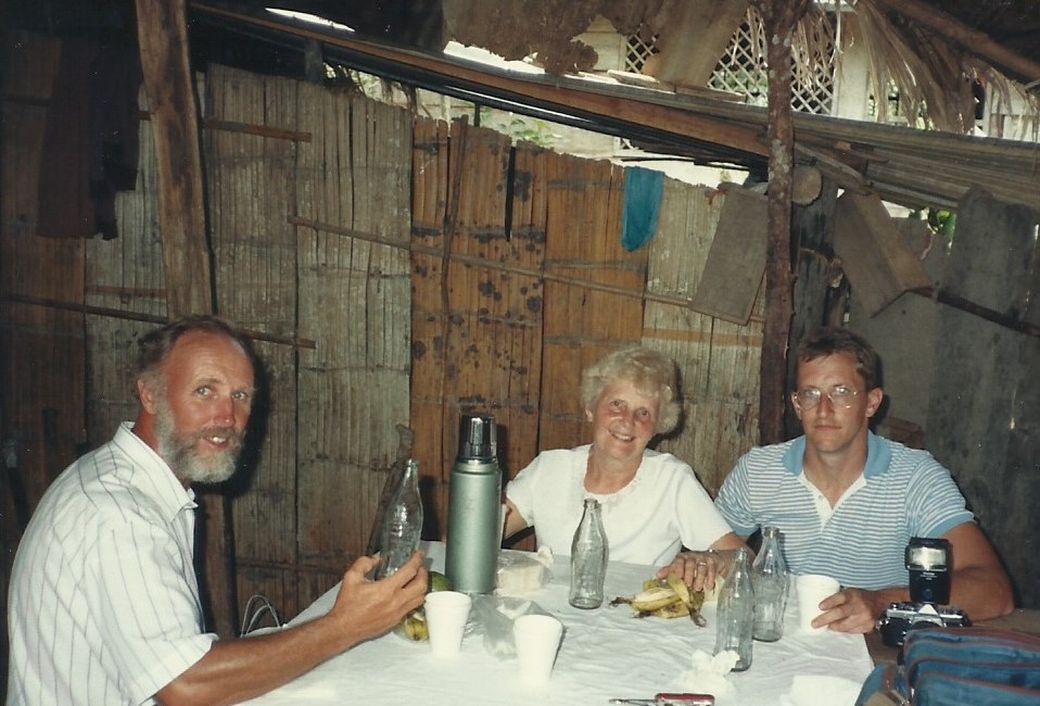 Bildene viser: Jeg sammen med Lennart og Isidro ved elvekanten, middag siste dagen på Betania for Willard, Chuck og Isidro. Tariri på Betania for å hente bensin til hjemreisen etter Bibeluka.